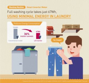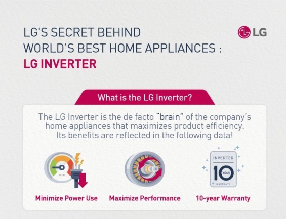 The secret advantage of LG Inverter motors and compressors over conventional models is precise speed control. Whether it’s a washing machine, refrigerator, air conditioner, or microwave oven, LG Inverters regulate the speed and revolution of motors and compressors depending on the situation, automatically adjusting the speed to maximize output and optimize results with less energy and less noise. Put in plain and simple, you always get to save.