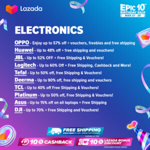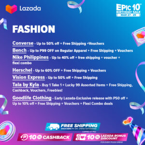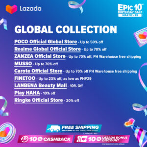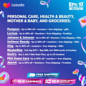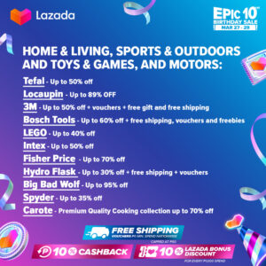 It’s an epic celebrat-10-n at Lazada’s Epic 10th Birthday sale happening from March 27 to 29. Ka-Lazadas can enjoy nationwide free shipping with no minimum spend, 10% Lazada Bonus Discount for every PHP 1,000 spend, and 10% cashback during the 3-day sale. What’s more? You can look forward to bagging amazing deals from these brands and sellers: