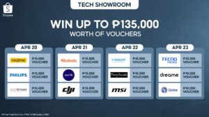 Shopee’s Tech Showroom shoppers will stand a chance to win vouchers from well-loved tech brands realme, Philips Official Store, GameXtreme, DJI, Deerma, Mcdodo Philippines, Dreame, Globe, Tecno Mobile, PerySmith, MSI, and VEGER.
