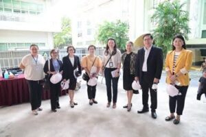(from left) SM Foundation (SMFI) SAVP for Education Eleanor Lansang, SM Investments VP for Securities Judith Balderrama, Henry Sy Foundation (HSF) treasurer Virginia Yap, SMFI Executive Director and HSF Trustee Debbie Sy, HSF Executive Director Dr. Lydia Echauz, SMFI and HSF Trustee Engr. Ramon Gil Macapagal are welcomed by Dr. Joreen Rocamora, Director of the UST Office of Public Affairs.