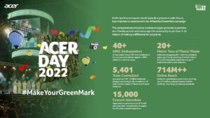 Acer Philippines staged a “Green Mark” concert featuring a line-up of famous Filipino artists, and fans earned tickets through green initiatives like donations to The Green Earth Heritage Foundation and plastic contributions to The Plastic Flamingo. This made the event a milestone in environmental commitment.