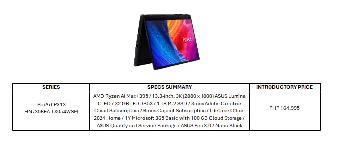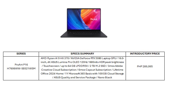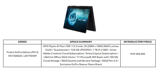 The ProArt P16 (H7606), the limited ProArt GoPro Edition (PX13), and the ProArt PX13 (HN7306) will be available at authorized ASUS Concept Stores across the Philippines in the coming weeks. All three ProArt laptops include 3 months of Adobe Creative Cloud Subscription, 6 months access to Capcut, Office 2024 Lifetime License, 1-year access to Microsoft 365 Basic with free 100 GB cloud storage, and the ASUS Quality and Service package, with a 2-year International Warranty and a 1-year Accidental Damage Protection.