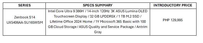 WHERE TO BUY AND INCLUSIONS The Zenbook DUO and Zenbook S14 will be available at ASUS Stores with exclusive ASUS Laptop Sleeves, Office 2024 Lifetime License, 1-year access to Microsoft 365 Basic with free 100 GB cloud storage, and the ASUS Quality and Service package – featuring a 2-year International Warranty and 1-year Accidental Damage Protection.