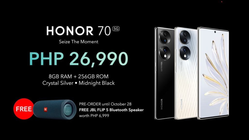 Starting from Oct. 18, 2022, the HONOR 70 5G will be available in Lazada and HONOR stores nationwide. Customers can get a free premium JBL Flip 5 Bluetooth Speaker worth Php 6,999 if they purchase from Oct. 18 to 28, 2022.