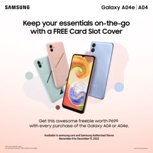 As a limited-time offer, the Galaxy A04 and Galaxy A04e will come with a FREE Card Slot Cover worth P699 for every purchase from November 4 to December 11, 2022. This will be available in all Samsung Authorized Stores, online platforms, and partner dealers nationwide.