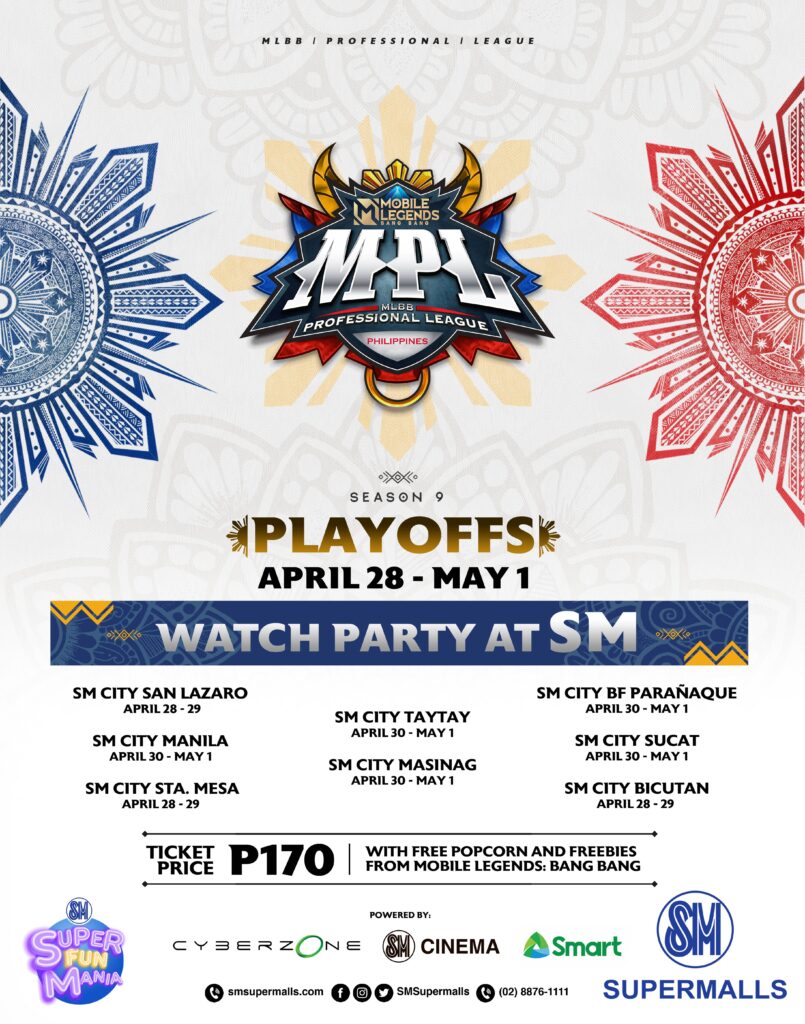 In partnership with SM Cinema, SM Cyberzone, and Smart Communications, Inc., enjoy an immersive viewing experience as you cheer for your favorite teams while watching the matches on the big screen! Select SM Supermalls would include SM City San Lazaro, SM City Sta. Mesa and SM City Bicutan who will be having their viewing parties on April 28-29, and SM City Taytay, SM City Masinag, SM City Manila, SM City BF Paranaque and SM City Sucat on April 30-May 1, or until the Grand Finals. Tickets are sold at only Php170, inclusive of a tub of popcorn and exclusive freebies from Mobile Legends: Bang Bang. Fans may purchase tickets from SM Cinema’s official website, SM Cinema ticket booths, or via the SM Cinema app.