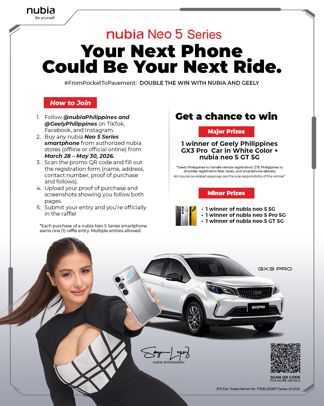 nubia Philippines has partnered with Geely Philippines for an exciting raffle promotion that connects performance in tech with performance on the road. With every purchase of the new nubia NEO 5 Series, customers get the chance to win a brand-new Geely GX3 Pro S along with a nubia NEO 5 smartphone!